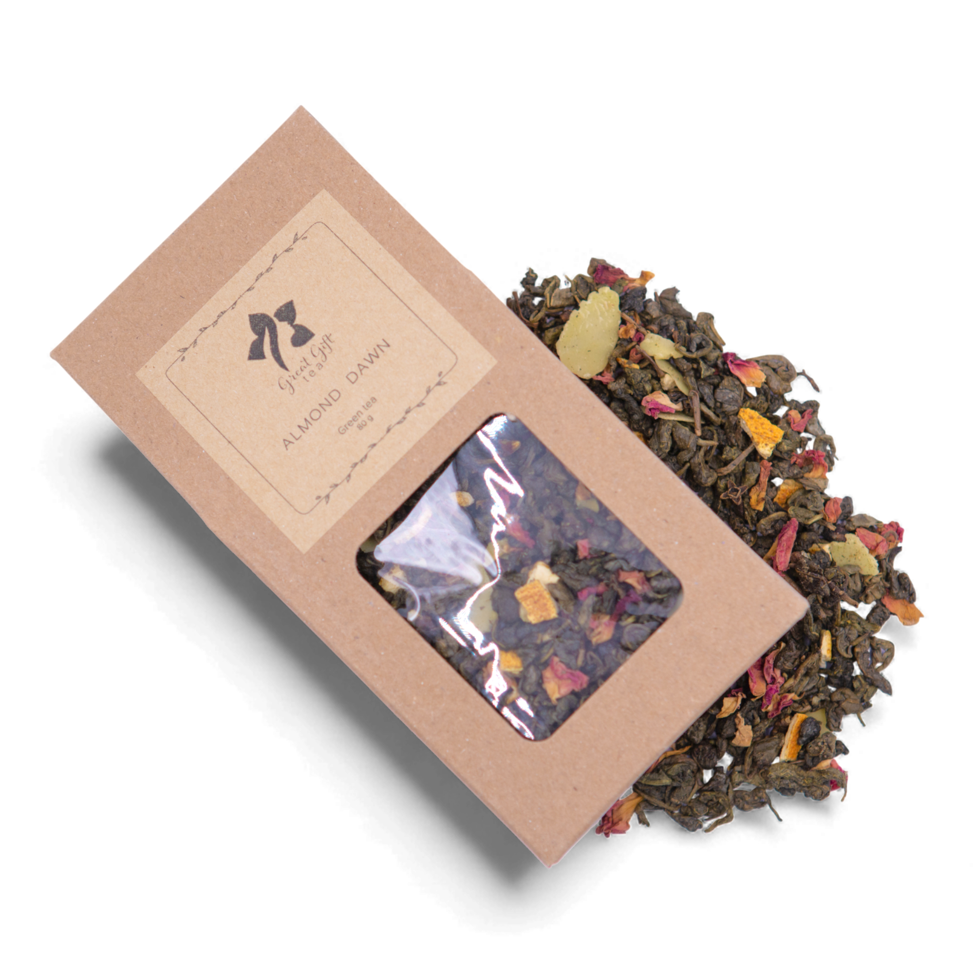 Awaken gently with Almond Dawn-a refined blend of Chinese Gunpowder green tea and creamy almond notes. Orange peel brightens the cup, while cloves add a delicate, warming spice. Raisins and rose petals round the profile with plush sweetness and a floral whisper, complemented by raspberry leaves for a soft, herbaceous finish. Comforting yet fresh, it’s a serene start to any day.