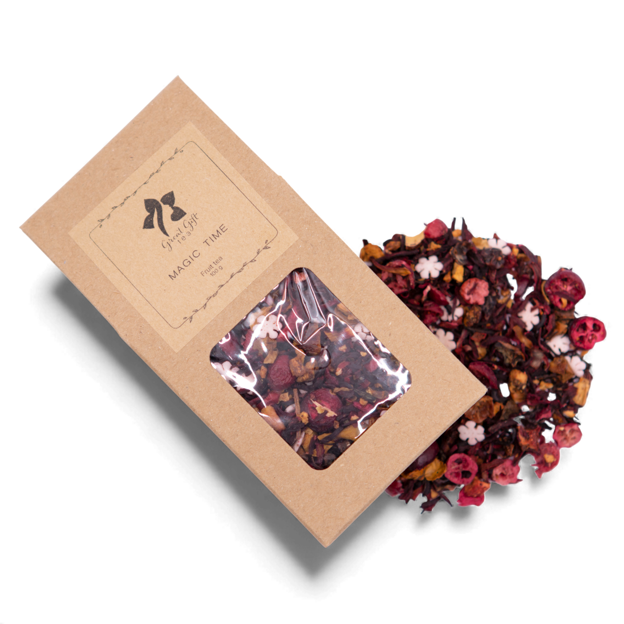 Make every moment a Magic Time with this bright, lively fruit blend. Hibiscus and rose peel deliver a ruby-red tartness, balanced by mellow apple. Notes of cranberry, cherry, and strawberry weave together for a juicy, festive medley, while charming sugar decorations and natural flavouring complete the experience. Bold yet beautifully balanced, it’s perfect for cozy evenings or a playful iced tea twist.