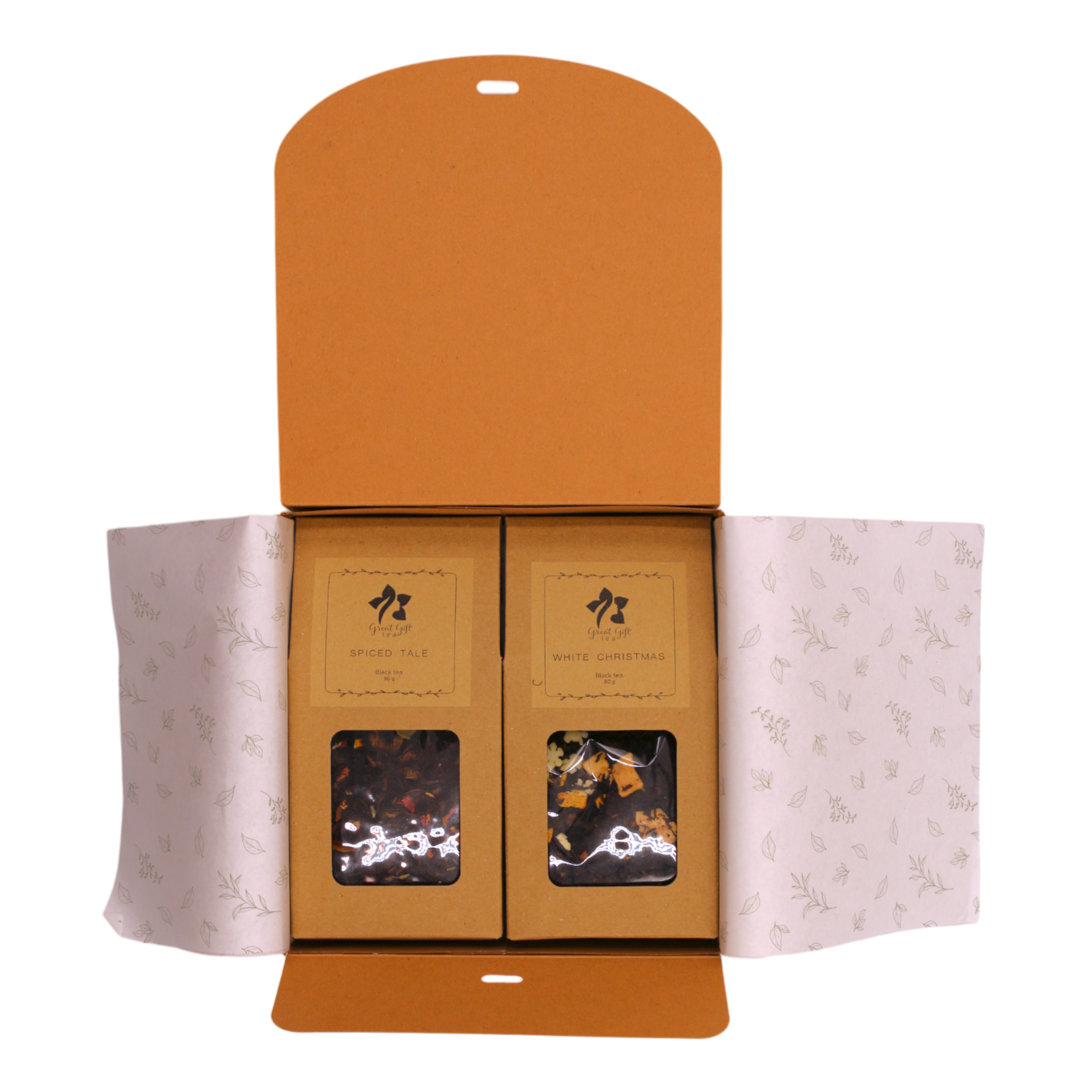 This set of two winter teas is designed for cold evenings and calm moments at home – whether you enjoy them on your own, as a couple or with friends and family. Warming blends with notes of spices, citrus and dried fruit create a cosy atmosphere and invite you to slow down and savour the moment. You can also choose the type and flavour of the teas yourself, tailoring the set to your preferences or to the taste of the person receiving the gift. This makes every gift more personal, thoughtful and perfectly on point.