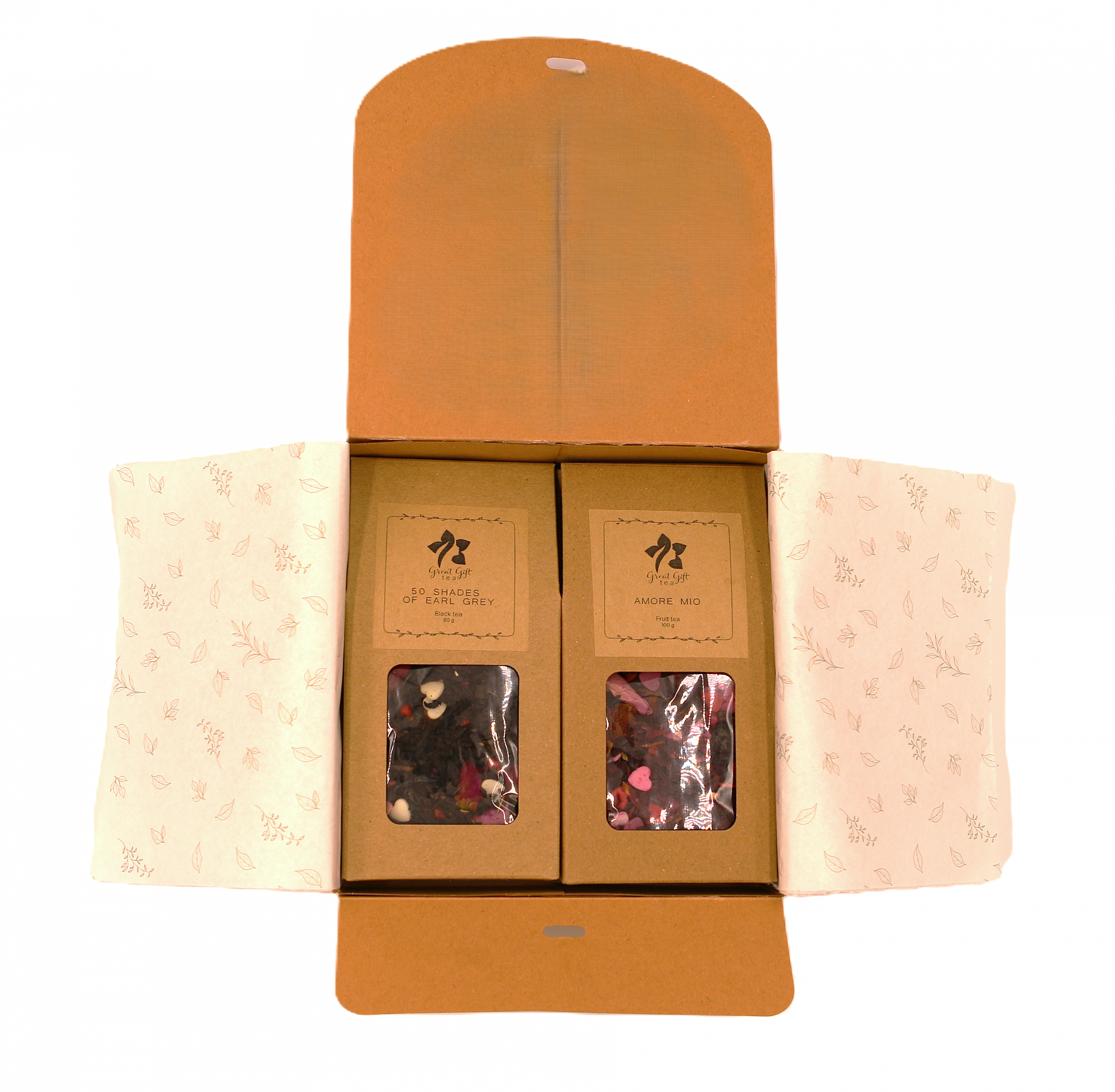 50 Shades of Earl Grey- an elegant Yunnan black tea with delicate rose buds, red pepper and sugar decorations, combining classic sophistication with a hint of boldness. Amore Mio-a sensual blend of hibiscus, rose peel and cut peony flowers with sweet sugar decorations that delight the senses.